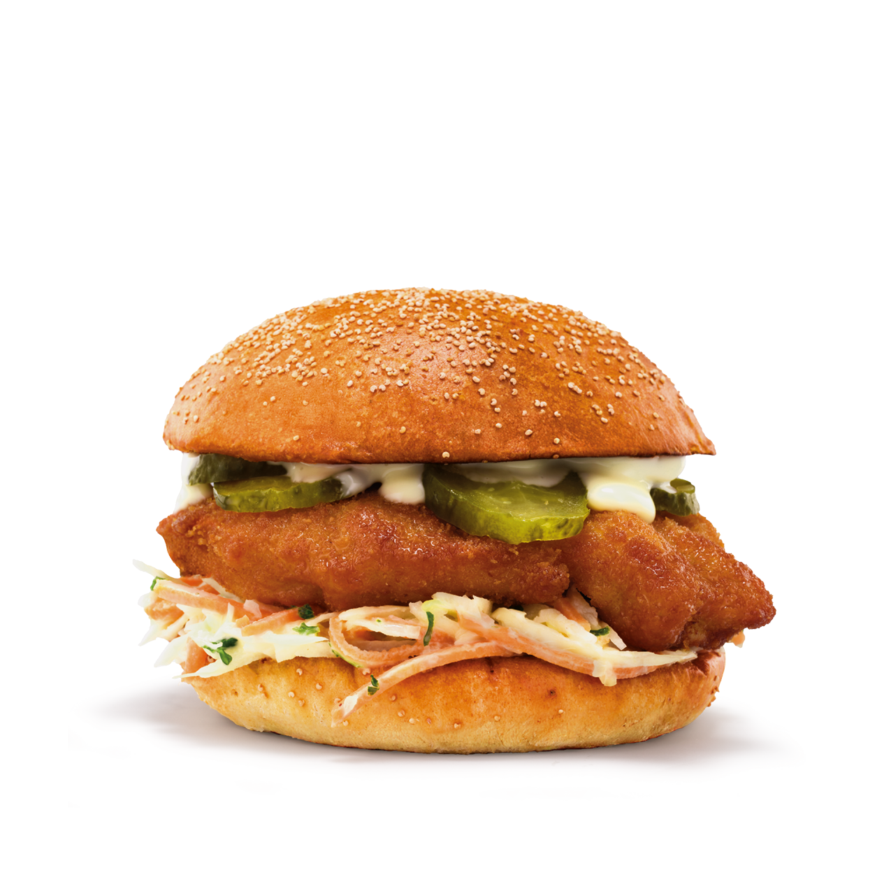 JB Potato Bun, knusprige Hähnchenkeule, Coleslaw Salat, Mayo und Gewürzgurken